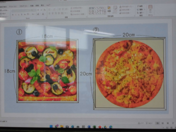 今日の学習のめあては、「2つのピザは、どちらが大きいだろうか。」です。