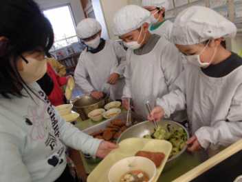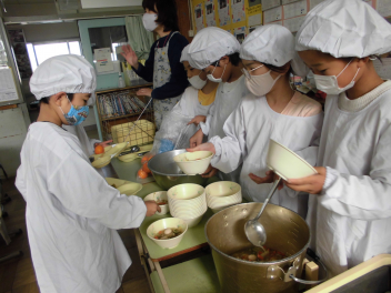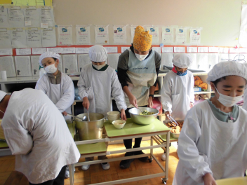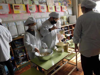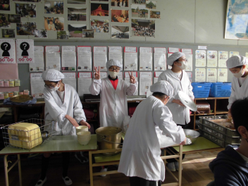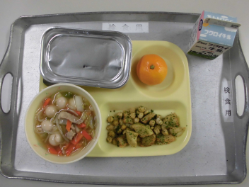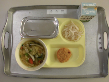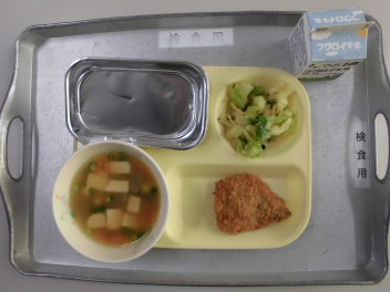 「ほうれん草のクリームスープ」には、ほうれん草のほかに、鶏肉と玉ねぎ、人参、じゃがいもが入っていました。牛乳やバター、脱脂粉乳等を使って煮込んだスープは、心も身体もぽかぽかになりました。
