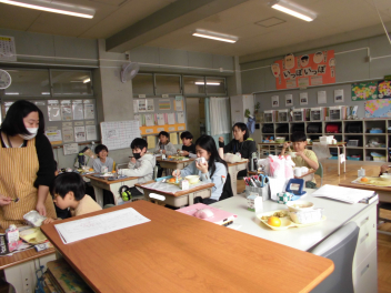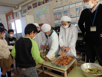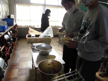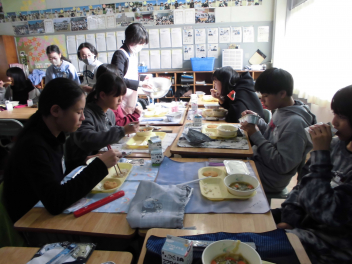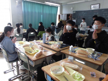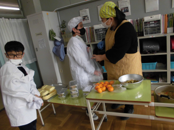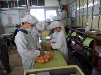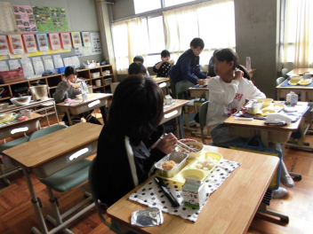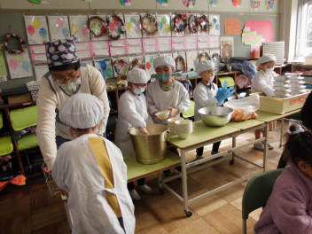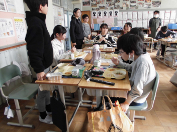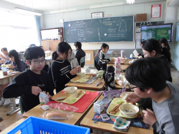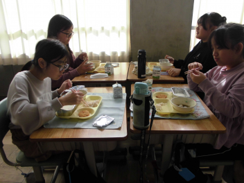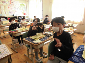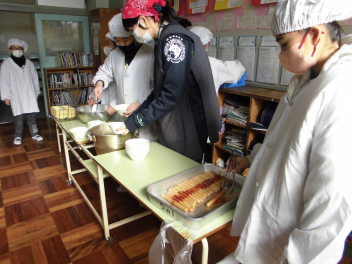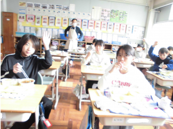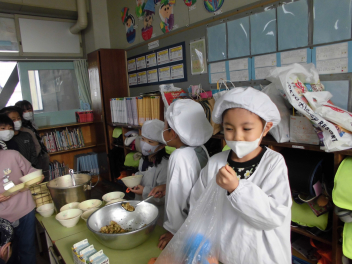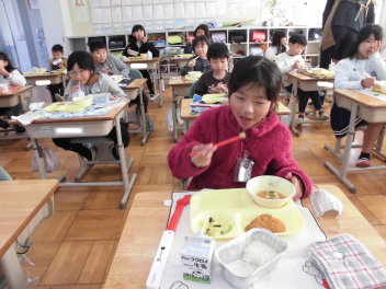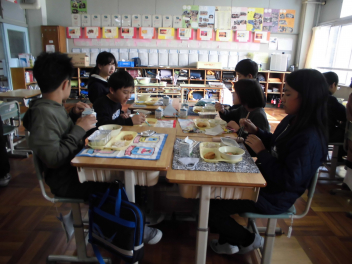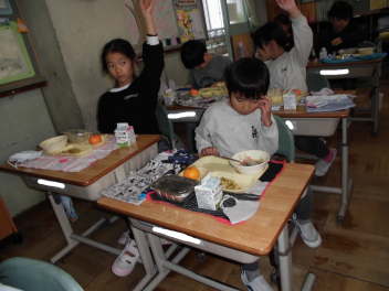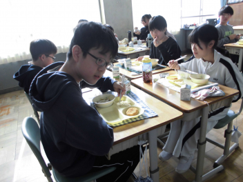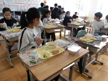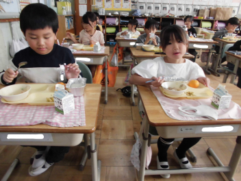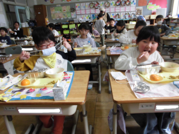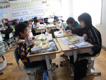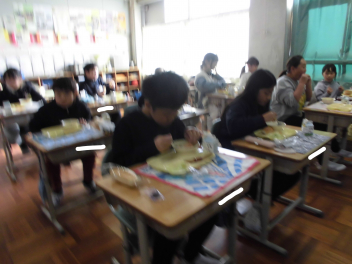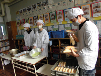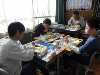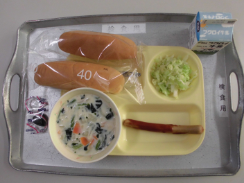 「ウインナーソーセージ」と「ボイルキャベツ」をパンにはさんで食べている子供が見られました。美味しそうにパンを頬張る子供たちの様子から、こちらがニコニコになりました。ボイルキャベツがさっぱりとしていました。