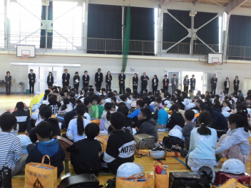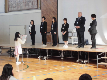 校長先生とPTA会長さんから、式辞やお祝いの言葉をいただきました。どの子も真剣に聞き、「これからどんな困難に遭っても、しなやかにたくましく進んでください。」という言葉に、大きくうなずいていました。5年生や職員と一緒に歌う校歌も今日が最後になります。