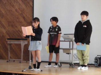 閉式後には、一生懸命練習した巣立ちの言葉を披露しました。卒業生一人一人が、鴨江小学校での思い出と、これまで支えてくれた方々への感謝の気持ち、未来に向けての期待や希望などを、心をこめてしっかり伝えていました。式の終わりには、合唱曲「群青」の美しい歌声が体育館中に響き、参加者全員の心に残る、素晴らしい卒業式になりました。