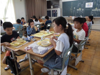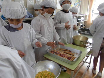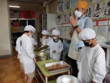 「さんまの蒲焼」は、今が旬のさんまを蒲焼にしました。今年のさんまは、脂が乗っているおいしいさんまで、「奇跡のさんま」と言えるくらい大きいサイズのさんまだといいます。そんなさんまを今日は、蒲焼にしていただきました。蒲焼と言えば、うなぎを想起しますが、さんまの蒲焼も美味しいですね。蒲焼とは、身の長い魚を開いて中骨を取り除き、串を打った上で、素焼きしてから濃口醤油、みりん、砂糖、酒などを混ぜ合わせた濃厚なたれをつけて焼く魚料理で、照り焼きの1種です。給食室手作りの濃厚のたれがとても美味しかったです。とても大きなさんまでびっくりしました。