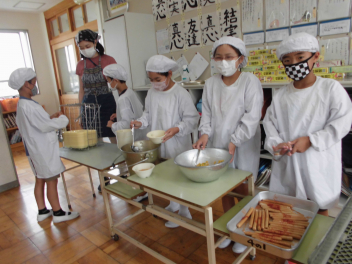 「さつまいもの素揚げ」は、さつまいもを油で揚げました。さつまいもを大きめに切り、ほくほく感が出るように工夫したそうです。さつまいもの甘みがいっぱい詰まっていて美味しかったです。