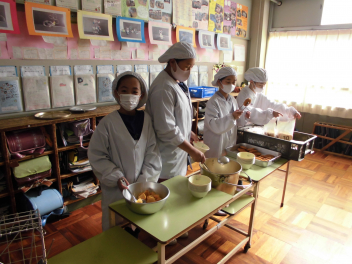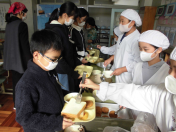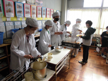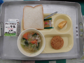 「キャベツとブロッコリーのサラダ」は、茹でたキャベツとブロッコリー、スイートコーンを給食室手作りのドレッシングで和えました。食べやすいように、ブロッコリーを小さめに切ったそうです。