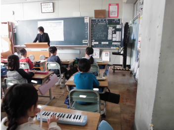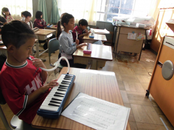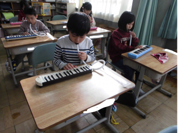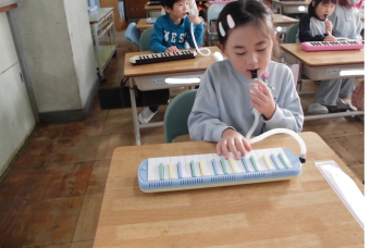 •  月曜日の1時間目、1年生の教室から、鍵盤ハーモニカの音色がきこえてきました。