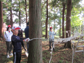 森アートクラブでは、自然の中での創作活動。木やひもを使って、大きな「蜘蛛の巣(?)」のようなアート作品を作っていました。森の中にとけ込むような作品で、まるで本物の巣のよう