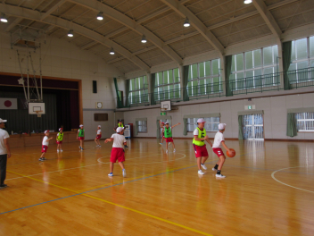 スポーツクラブでは、元気いっぱいにバスケットボール!コートを駆け回って、汗びっしょりになりながらも、チームで協力して頑張っていました