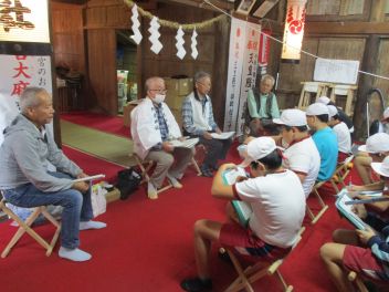 「どうして夏祭りにはたくさんの人が集まるの?」「赤い建物は何のためにあるの?」などといった疑問をもち、今回はそれを神社の世話人さんや宮司さんに直接インタビューして、詳しく教えていただきました。