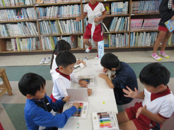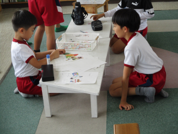 挑戦状クイズに取り組んで景品をもらう子、ぬり絵に色をつける子…