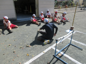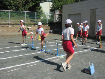 そして、今度はフォームの確認。ハードルの横を進み、越えたところで、曲げた足をハードルに当たらないように上げます。子供たちは、少しずつ、感覚をつかんでいきます。