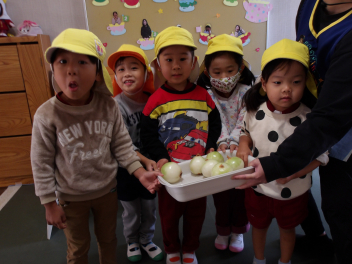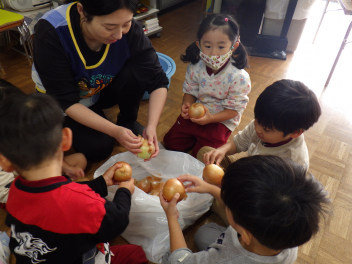 年中さんはタマネギの皮むきを担当してくれました