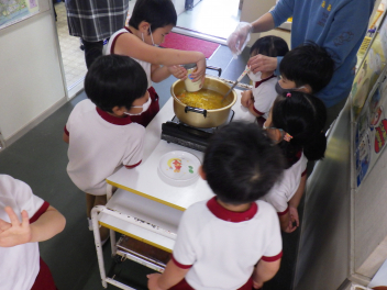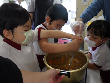 仕上げにカレーのルーやコーンを入れるときには、年中さんも一緒にみんなで担当しました!