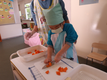 そして、年長さんがカレーの食材切りや具材炒めを担当してつくってくれました!