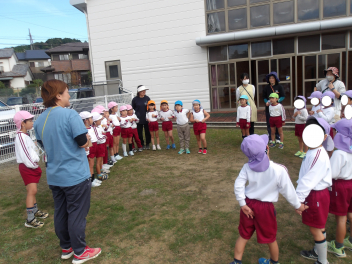 対面式で、園ごとに集まって紹介をして交流保育が始まりました!