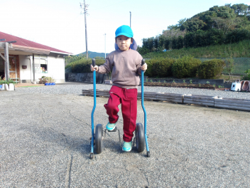 自転車に乗れる年長さんも、なかなかバランスをとるのが難しい、立ち漕ぎ車!ひたすら挑戦あるのみです