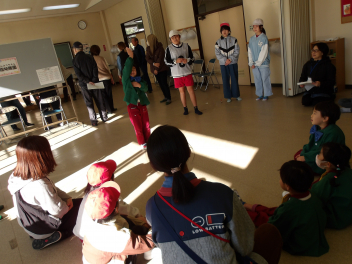 小学生が縦割り班ごと6チームに分かれて、地域内のチェックポイントを回りながら、それぞれのチェックポイントで自分たちが考えた出し物や遊びをして、地域の方と関わったり触れ合ったりします。