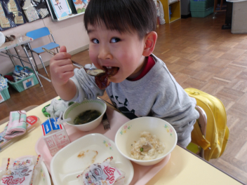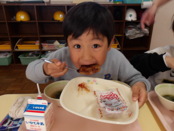 ハンバーグやスープの中のマカロニがハート形で『かわいいcheeky』と、こどもたちに大好評でした