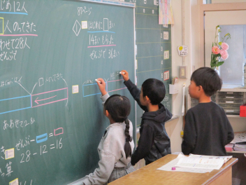 手を挙げた子供たちは、「なぜ、式が引き算になるのか」ということを自分なりに考えて、一生懸命説明していましたsad