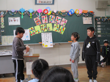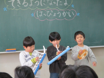 「できるようになったこと」を一人一人が発表したり、実際に家の人たちの前でやって見せたりした学年もありました。算数科の掛け算九九をすらすらと唱える子、鍵盤ハーモニカなどの演奏をする子、縄跳びでできるようになった技を披露する子、雲梯や逆上がりができた様子を映像で見てもらった子など、様々な発表が見られましたsad
