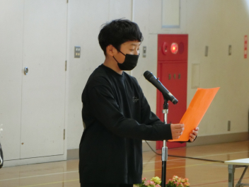 体育館では、まず、新しい先生方をお迎えする、新任式を行いました。新6年生の代表の子が、新任の先生方に向けてお迎えの言葉を堂々と述べました