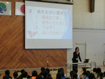 始業式でもお話しましたが、まず、身に付けてほしい力は「お話を聞く力」です。人は一人では生きていけません。誰かに助けられたり、誰かを助けたりしながら生きています。誰かと心を通い合わせるためには、まず、言葉を交わすことが大切です。中でも、誰かの「お話を聞く」ことは、相手の考えを知ることや、相手を受け入れることにつながります。「お話を聞く」ことは、人と人をつなぐために一番もとになる、一番大切な行動です。