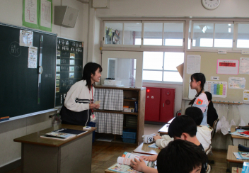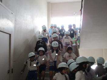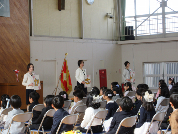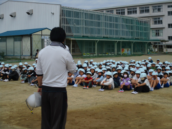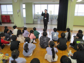 始業式の終了後、生徒指導の先生からのお話がありました。子供たちは、話す人の方を見ることを意識しながらお話を聞くことができました。