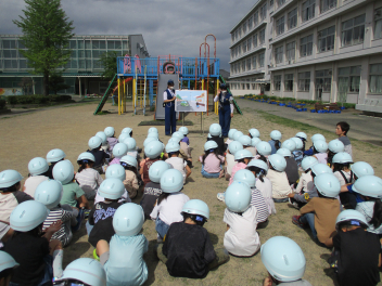 始業式の終了後、生徒指導の先生からのお話がありました。子供たちは、話す人の方を見ることを意識しながらお話を聞くことができました。