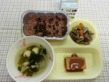 赤飯 牛乳 ごま塩 豆腐田楽 吹きよせ