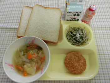パン 牛乳 さつまいもコロッケ ごぼうサラダ 免疫力アップスープ 乳酸菌飲料