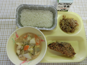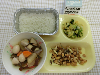 米飯 牛乳 あじの南部揚げ もやしのおかか炒め いもこ汁
