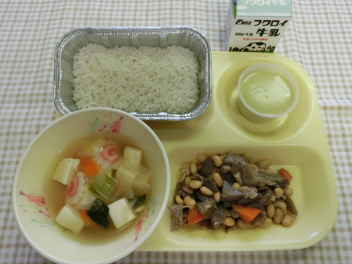 「大和煮」とは、肉を砂糖やしょうゆで味付けし、しょうがなどの香味野菜を加えた料理のことを言います。本来は、くせの強い肉でも食べられるくらい濃い味にしますが、給食では食材の味を生かした味付けにしています。給食が始まったころからある歴史ある献立です。一品で肉や野菜、豆類など幅広い食材を食べることができる、栄養満点のおかずです。