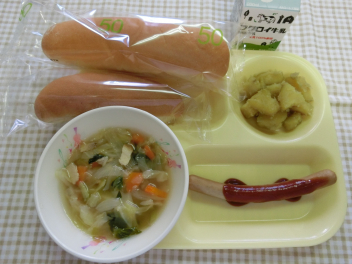 パン 牛乳 ウインナーソーセージ さつまいものバター煮 タアサイのスープ