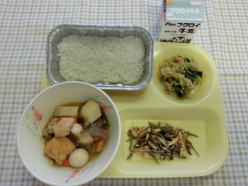 米飯 牛乳 関東煮 煮干しとアーモンドの甘辛あえ おひたし