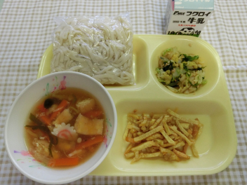 うどん 牛乳 きつねうどん いもかりんとう アーモンドあえ