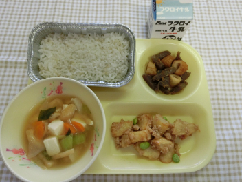 給食週間2日目の献立テーマは、「体力アップ献立」です。今日は、体力アップのために必要な「たんぱく質」や「鉄分」、「ビタミンB₁」を多く含む食品を取り入れました。たんぱく質は筋肉や血液など体を構成する重要な成分で、食事からとることが大切です。鉄分も、血液の材料となるので成長期にしっかりとりたい栄養素です。ビタミンB₁は炭水化物をエネルギ―に変える時に必要な栄養素です。体力を向上させて、冬の寒さに負けない体をつくりましょう。
