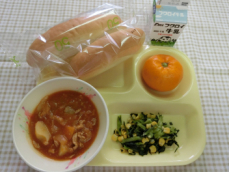 パン 牛乳 ポークシチュー 小松菜とコーンのソテー みかん