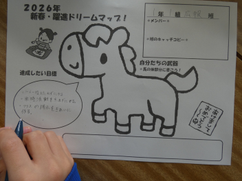 学級の班ごとで、「達成したい目標」「自分たちの武器」「達成のために今からできること」などを馬の絵の中に記入しました。