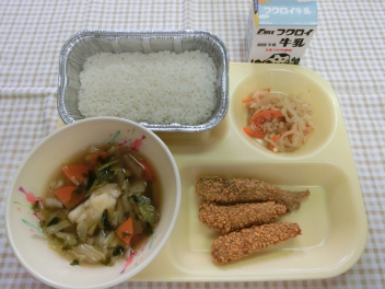 米飯 牛乳 いわしのカリカリ揚げ 七草すいとん 源平なます
