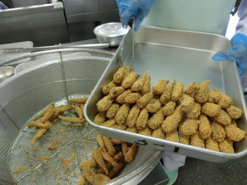 いわしのカリカリ揚げをバットにクラスごと数えています。