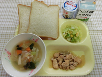 パン 牛乳 チキンの照り煮 キャベツのサラダ アルファベットスープ ヨーグルト