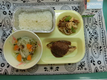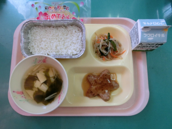 今日の給食は、入学・進級祝いの行事食で米飯・牛乳・和風ハンバーグ・三色あえ・若竹汁・お祝いクレープでした。