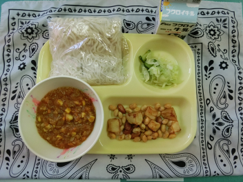 今日の給食はソフトめん・牛乳・山吹ソース・アーモンド入りミックス揚げです。