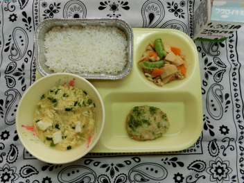 今日の給食は麦入り米飯・牛乳・はんぺんの磯辺揚げ・たけのこごはん・かきたま汁です。