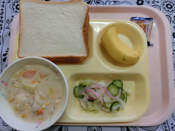 今日の給食はパン、牛乳、メープルジャム、コーンシチュー、春色サラダ、バナナです。
