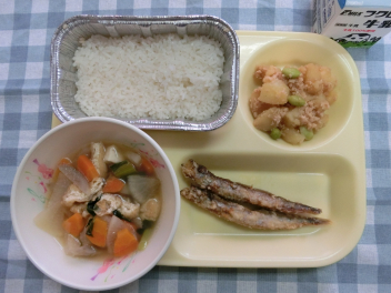 今日の給食は、米飯、牛乳、ししゃもの唐揚げ、じゃがいもの煮つけ、実だくさん汁です。