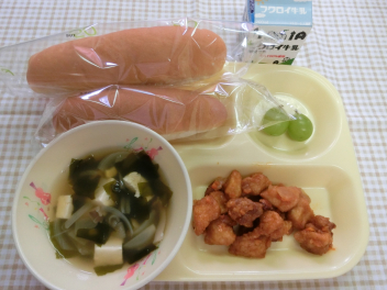 パン 牛乳 鶏肉とアーモンドのトマトソースあえ わかめスープ ぶどう