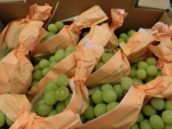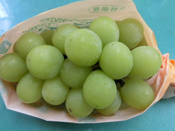今日のぶどうは長野県産のシャインマスカットです。特徴は「皮ごと食べられる」「種なし」「大粒」「高糖度」です。人気の果物です。