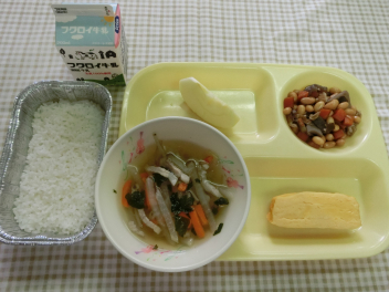 米飯 牛乳 厚焼き卵 五目豆 沢煮わん りんご