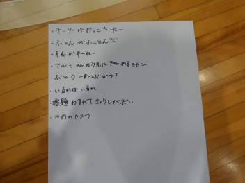 2回目は6人組を作りました。グループを組んだ後は、みんなでダジャレをできるだけたくさん考え、紙に書く、という活動を行いました。一番多いグループはなんと20個のダジャレを考えました。