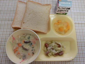 パン 牛乳 さつまいものシチュー キャベツとウインナーの煮込み ミックスフルーツ